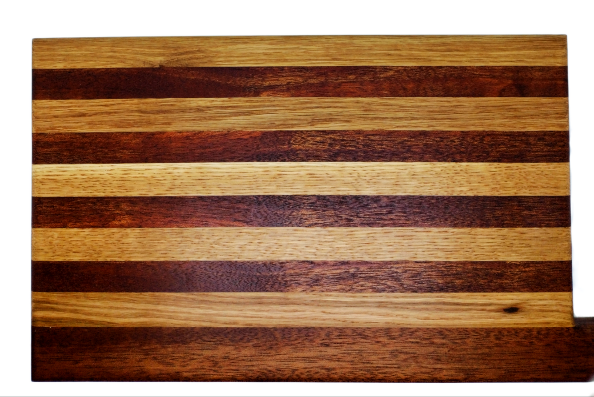 Beautiful, handcrafted reversible bread board/cutting board with handle. This masterpiece is handmade using walnut, maple, white oak, and mahogany wood. Custom-made cutting boards created by local artisans are an amazing gift to spruce up any kitchen. Get yours today and save with our end-of-summer sale while supplies last! These awesome cutting boards are customer favorites and have won first place at local county fairs! Our local woodworkers are always racing to keep them in stock.